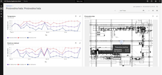 proizvodni hali Li-ionskih baterij v Prevaljah. Sistem omogoča spremljanje več kot 50 naprav, vključno z analizatorji električnega omrežja, klimatskimi napravami in prezračevalnimi sistemi, ki so integrirani v interaktivno spletno aplikacijo s prikazom po nadstropjih. Za naprednejši pregled podatkov uporabljamo spletno BI orodje Grafana. Prav tako smo razvili servisni modul z AR oddaljeno podporo in AR navodili preko očal za navidezno resničnost Hololens, kar je izboljšalo naše tehnične kompetence v razvoju IoT aplikacij. Bili smo tesno vpeti tudi na sodelovanje z ostalimi konzorcijskimi partnerji in izmenjavo podatkov preko centralnega vmesnika, ki je del centralnega podatkovnega skladišča. Pridobljena znanja smo implementirali tudi v interno različico sistema Greenhub za spremljanje razmer v delovnem okolju v naših pisarnah.