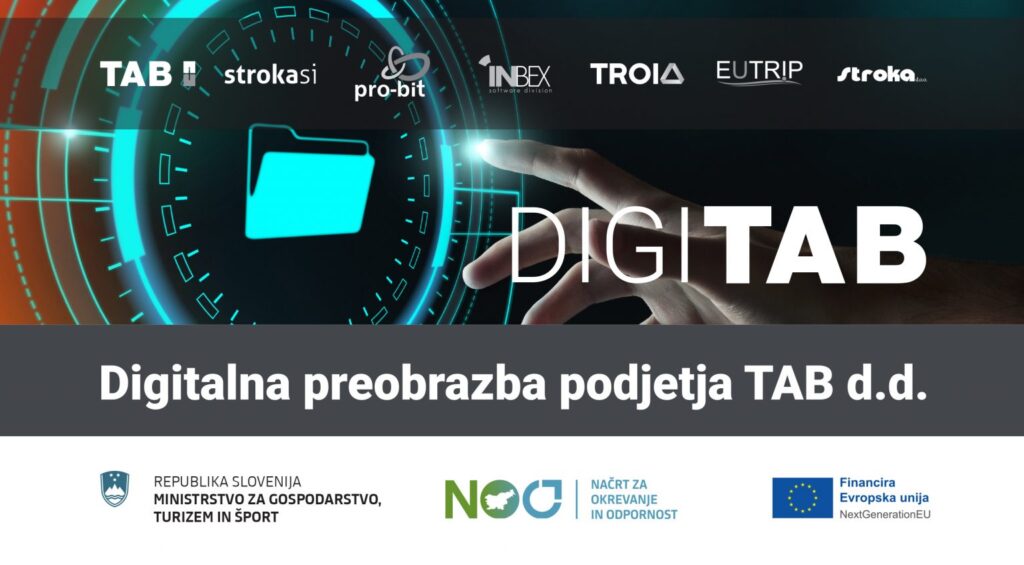 V okviru projekta DIGITAB smo s konzorcijskimi partnerji, družbami Stroka produkt, Stroka, Inbex, EUTRIP, TROIA in Pro-bit, pričeli z Digitalizacijo podjetja TAB d.d. v oktobru 2021. Projekt je trajal do aprila 2024.
