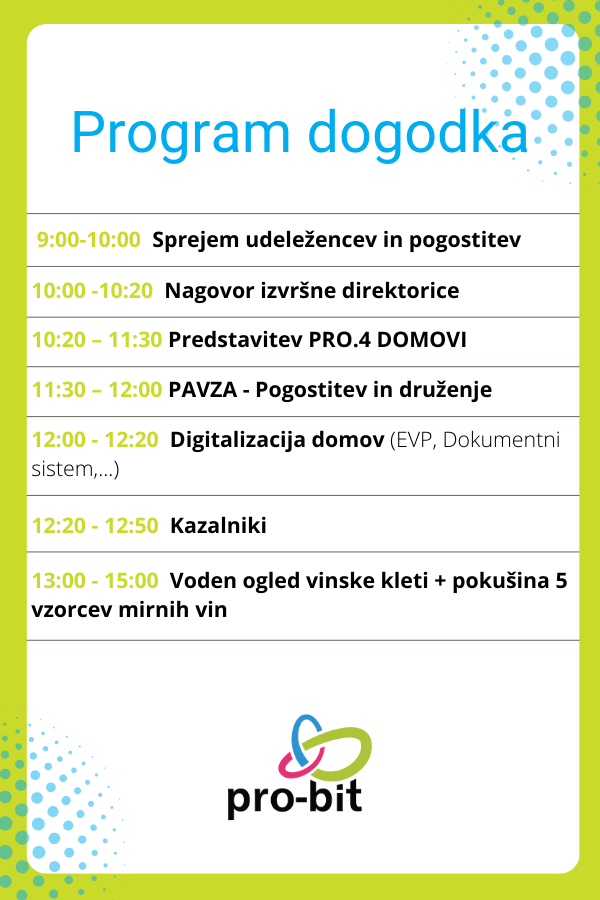 Ali ste vedeli, da v podjetju Pro-bit več kot 70 strokovnjakov že 33 let razvija 4. generacijo programske rešitve tudi za socialnovarstvene zavode na slovenskem trgu? Uporabljate za podporo svojemu poslovanju programsko opremo, ki ne izpolnjuje več zahtev, katere prinašajo novi trendi kot so trajnost in digitalizacija?